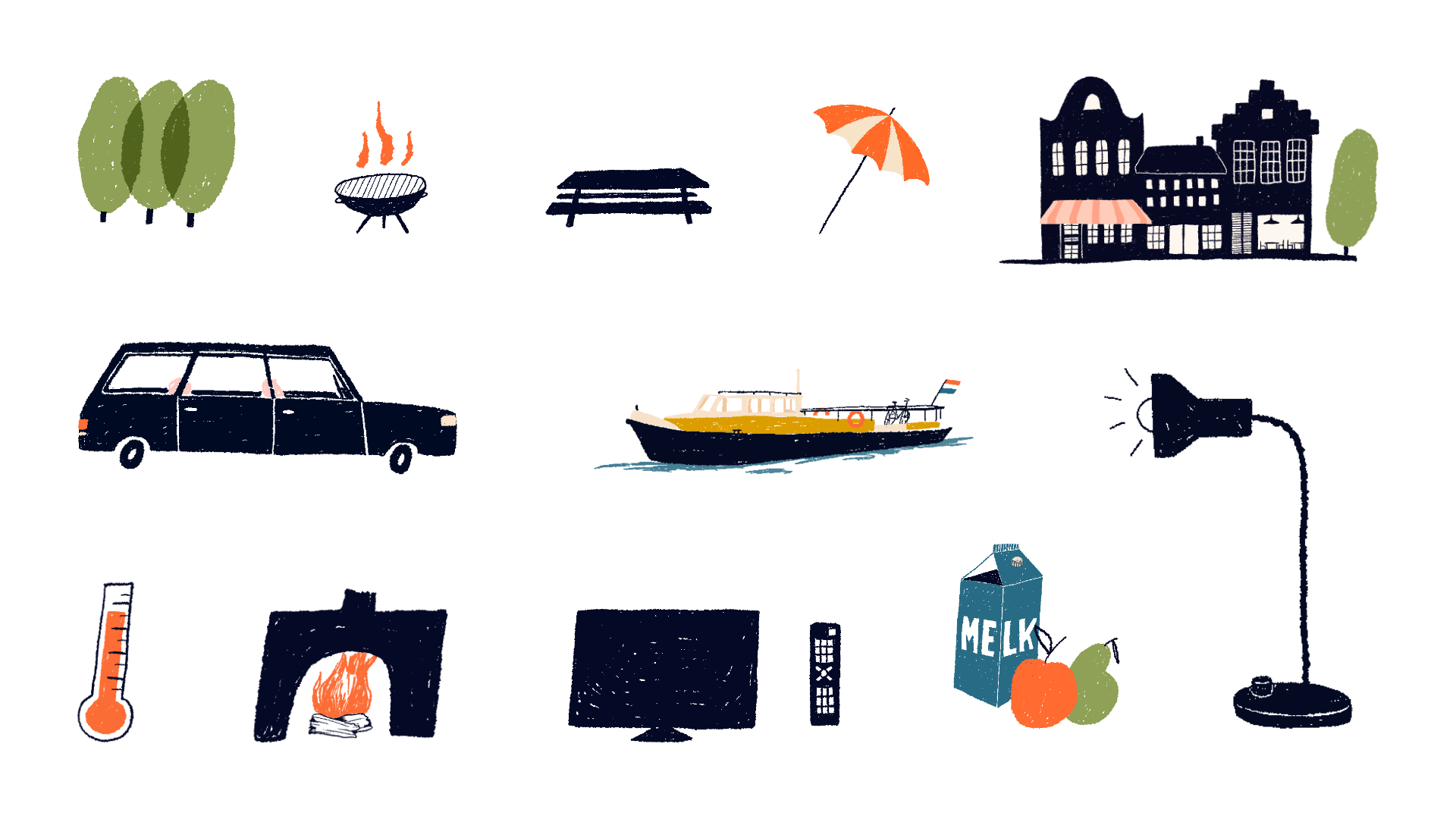Spot illustraties voor informatieboek van vakantiehuisje Waal aan Huis.